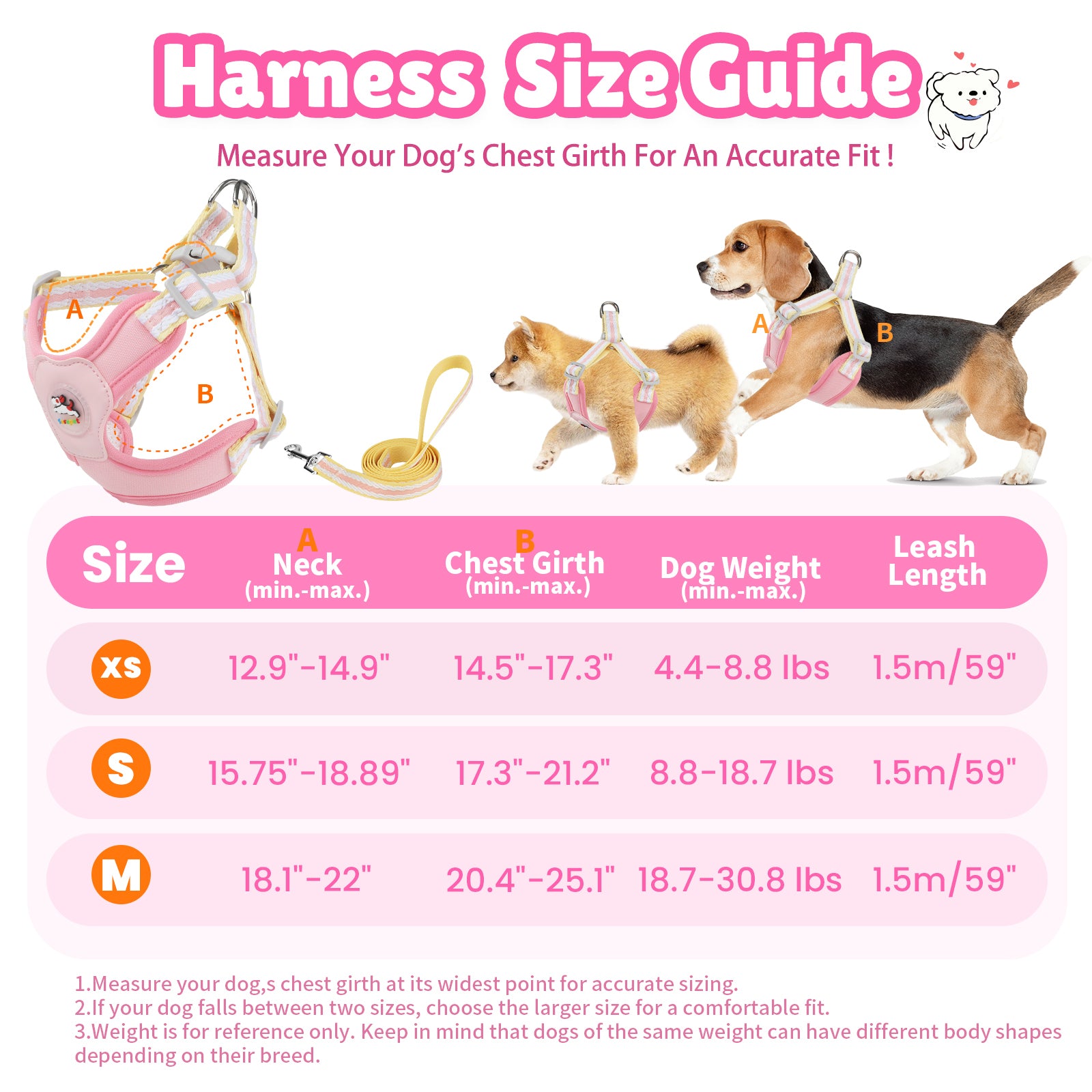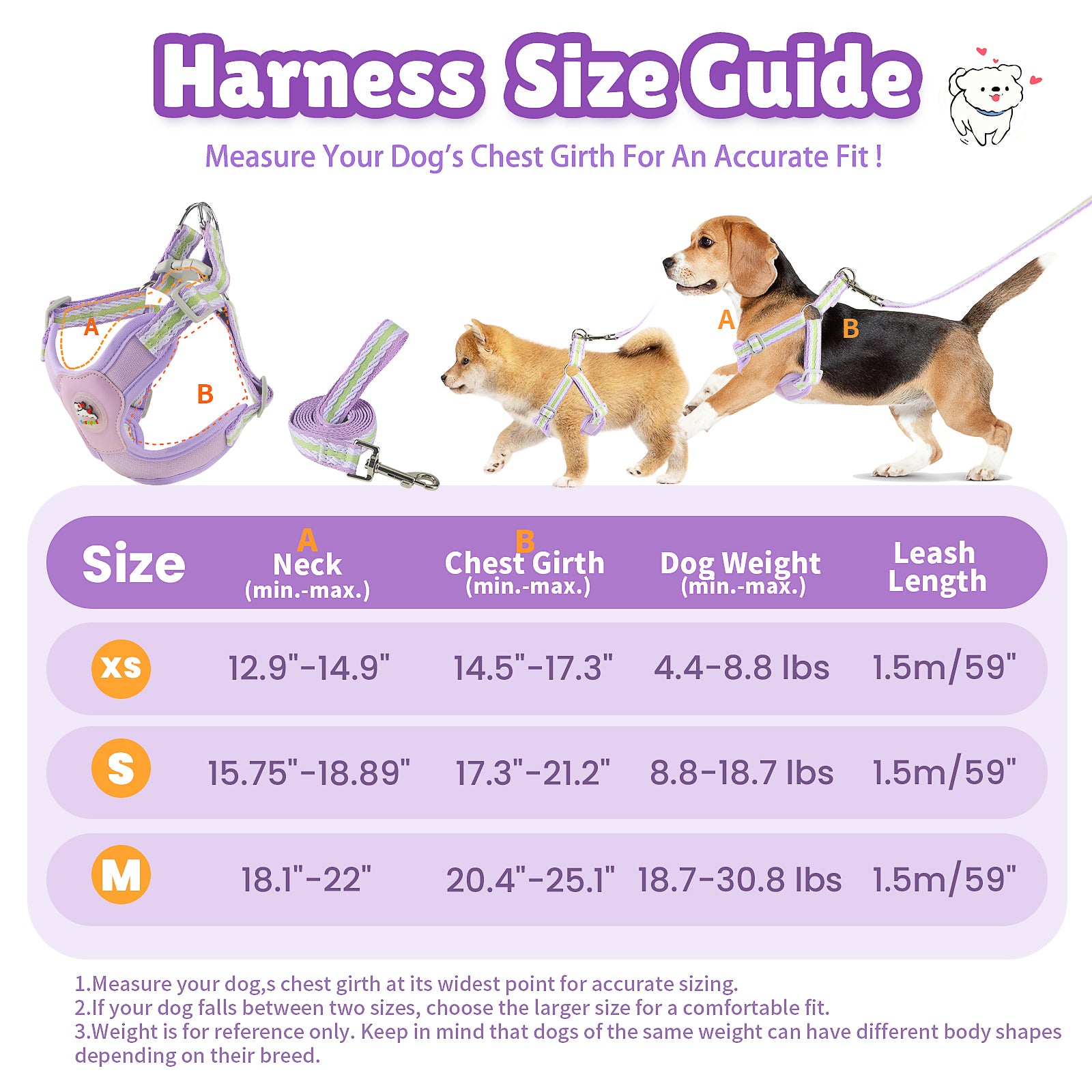 XS: Neck 12.9–14.9" | Chest 14.5–17.3" | Weight 4.4–8.8 lbs