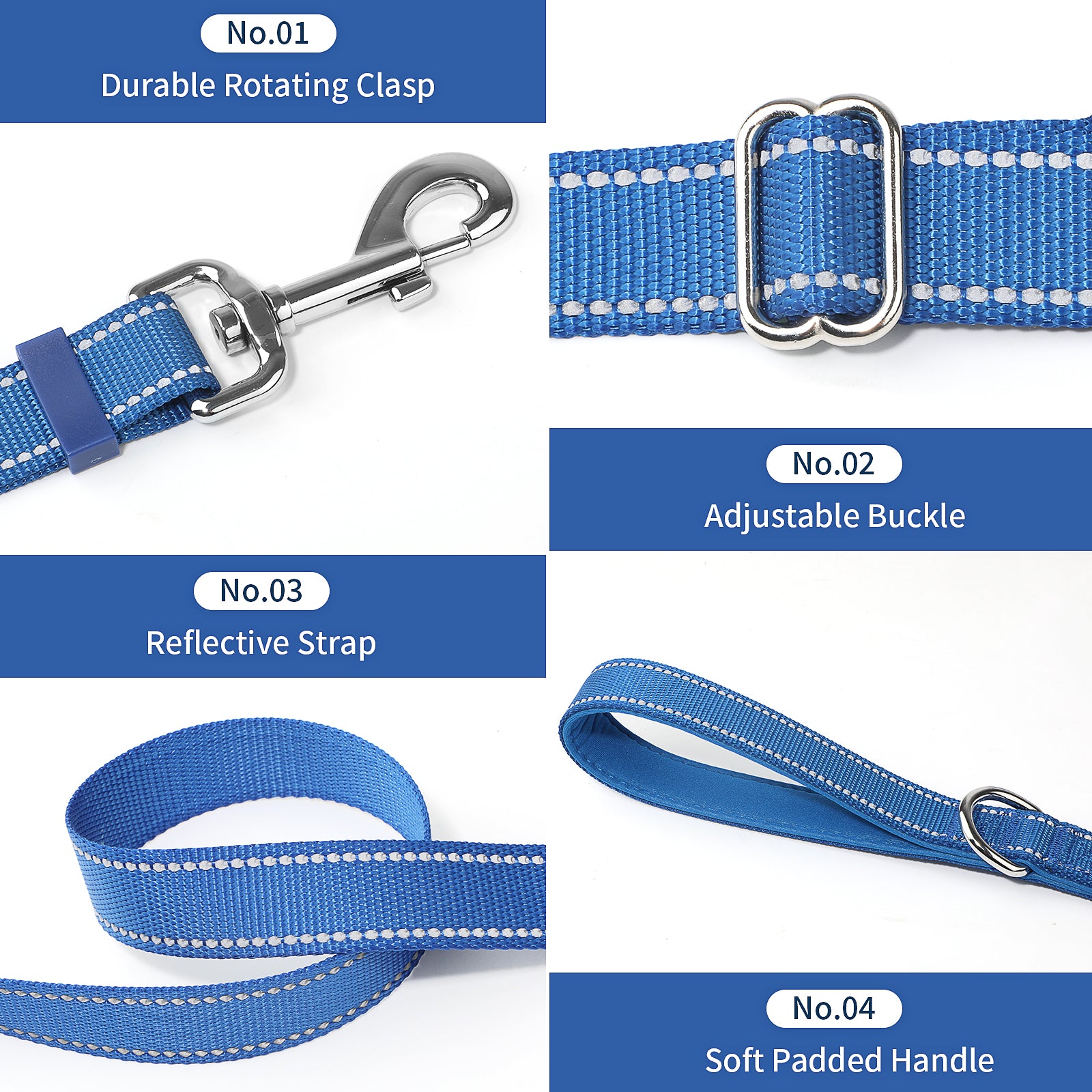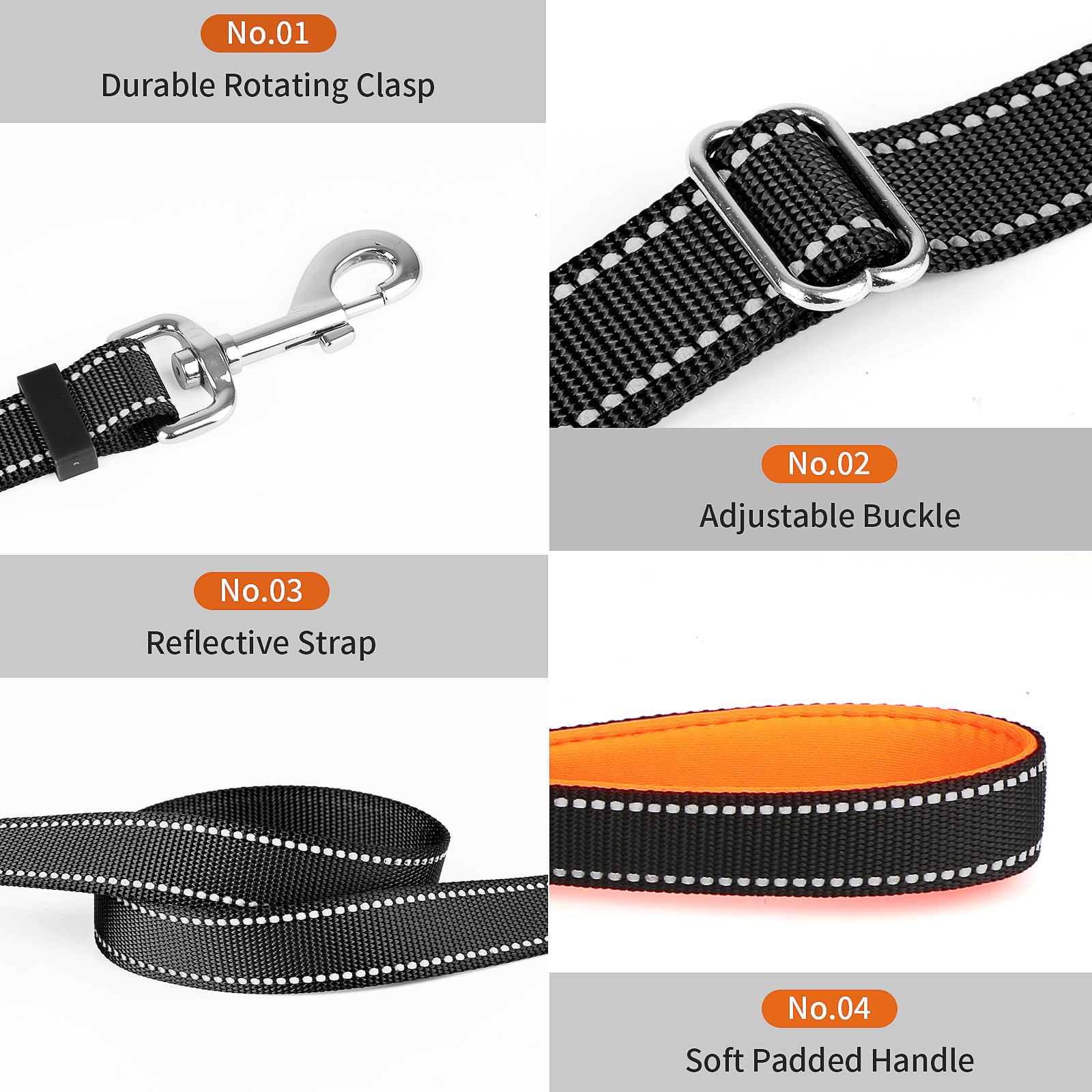 - REFLECTIVE AND NYLON MATERIAL: Nylon fabric with high density webbing to add durability. Luminous reflective threading through the full dog leashes enhances super high visibility and would be reflective when lights shine on them at night. Walking in the dark would be safe.