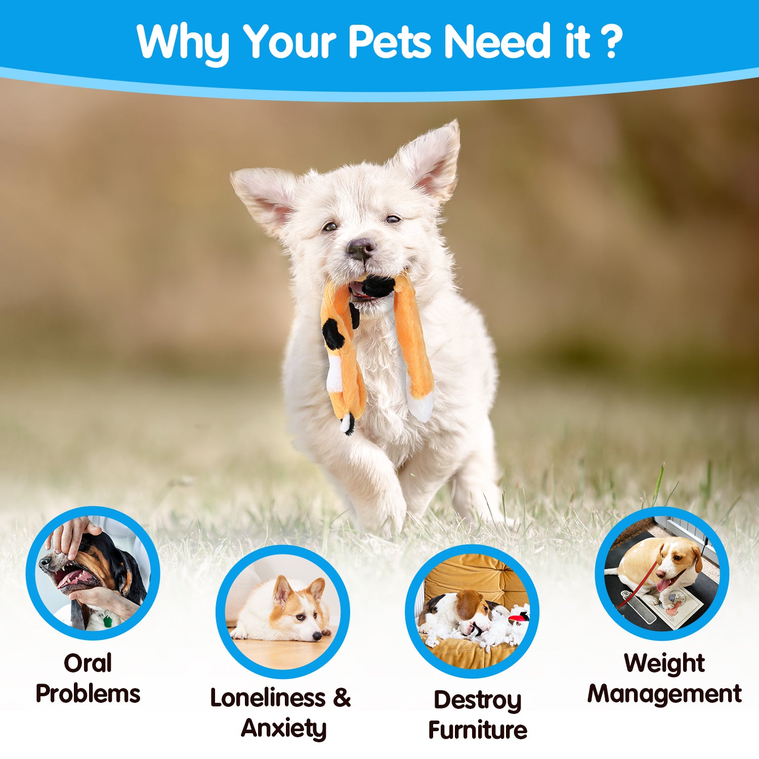 Health Benefits and Stress Relief: Our squeaky toys are designed to promote exercise and improve your dog's overall health. When you're away, these toys help alleviate your dog's anxiety and stress, keep their teeth clean, and reduce destructive behavior. They're perfect for keeping your dog happy, healthy, and out of trouble.